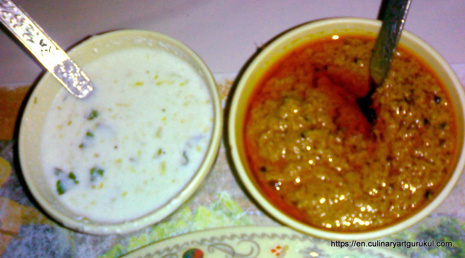 Two biryani accompaniments – mirchi ka salan and raitha or dahi chutney